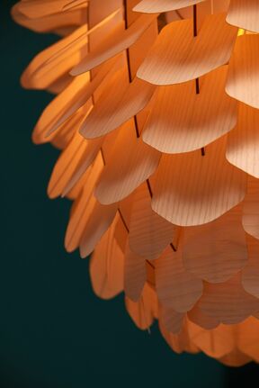 Die sorfältig handgefertigten Lamellen aus zertifiziertem Eschen- oder Eichen-Furnier werden an den Innenflächen beleuchtet. Während das Eschen-Furnier heller wirkt und eine höhere Lichtleistung ermöglicht, erscheint das Eichen-Furnier dunkler und bringt die natürliche Holzstruktur zur Geltung.