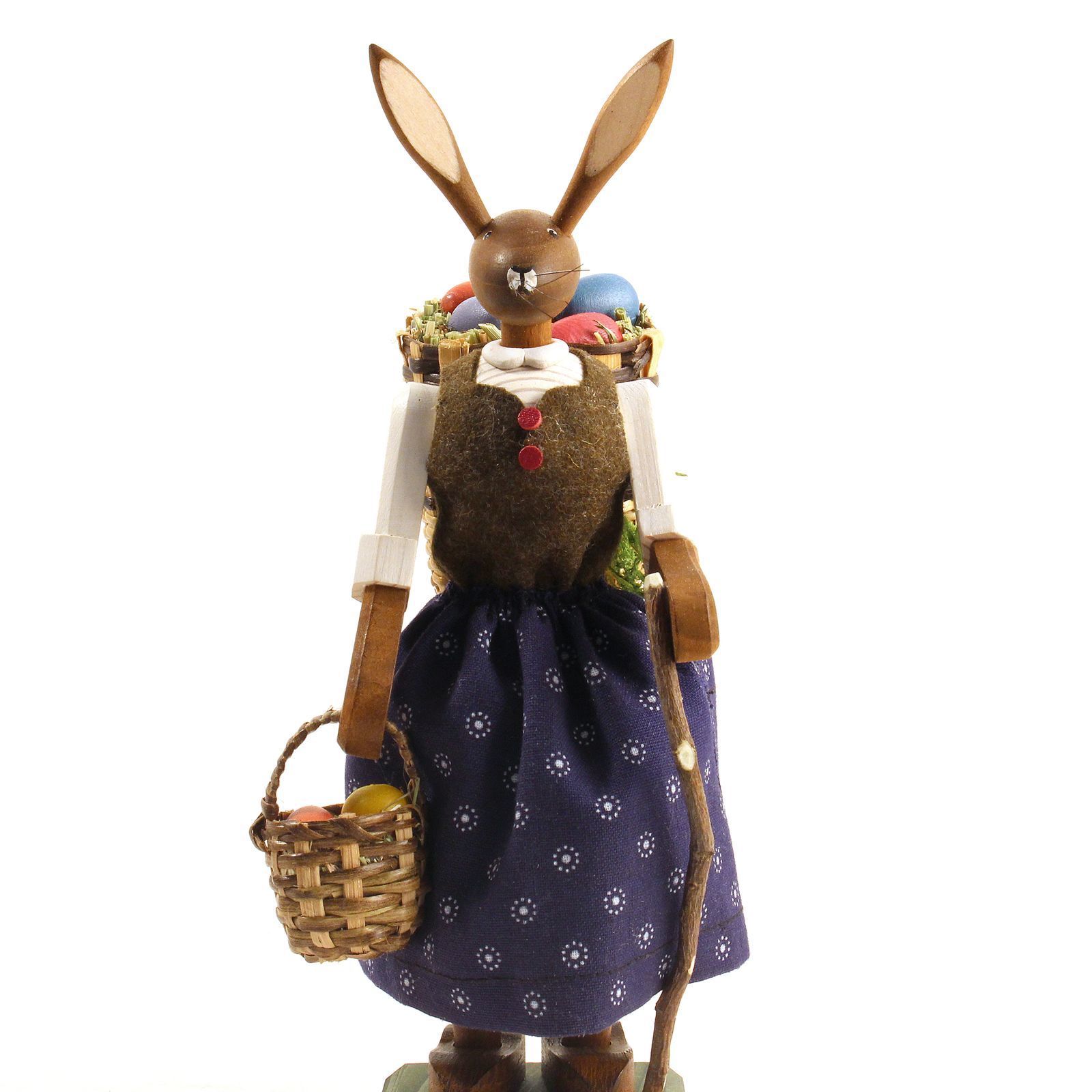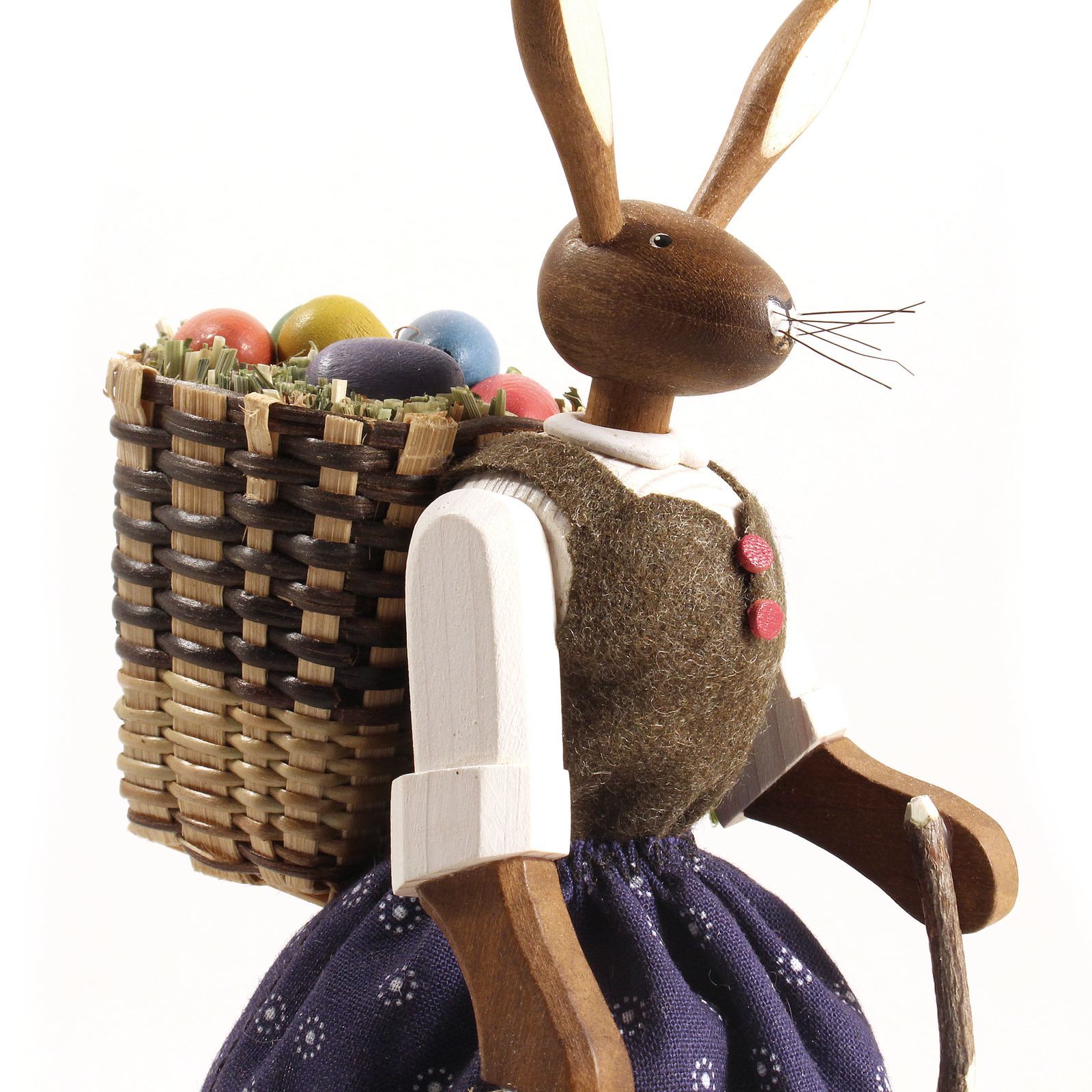 Diese wunderschöne Osterhasenfrau ist gestalterisch angelehnt an die bekannte "Häschenschule" und wird auch wie die Osterhasen aus Fichtenholz gedrechselt und beschnitzt. Alle Figuren sind das Ergebnis reiner Handarbeit. Bei der Farbgebung wird großer Wert darauf gelegt, die natürliche Schönheit des Holzes zu betonen, daher sind nur wenige Teile deckend bemalt. Ganz besonders auffallend und typisch sind die mit Liebe zum Detail gestalteten Accessoires. Der Rock ist in originalem Blaudruckverfahren gefärbt worden, Körbchen und Rückenstütze sind handgeflochten und die farbgebende Bemalung ist so sensibel angebracht, dass man die Strukturen des Holzes noch gut erkennen kann.