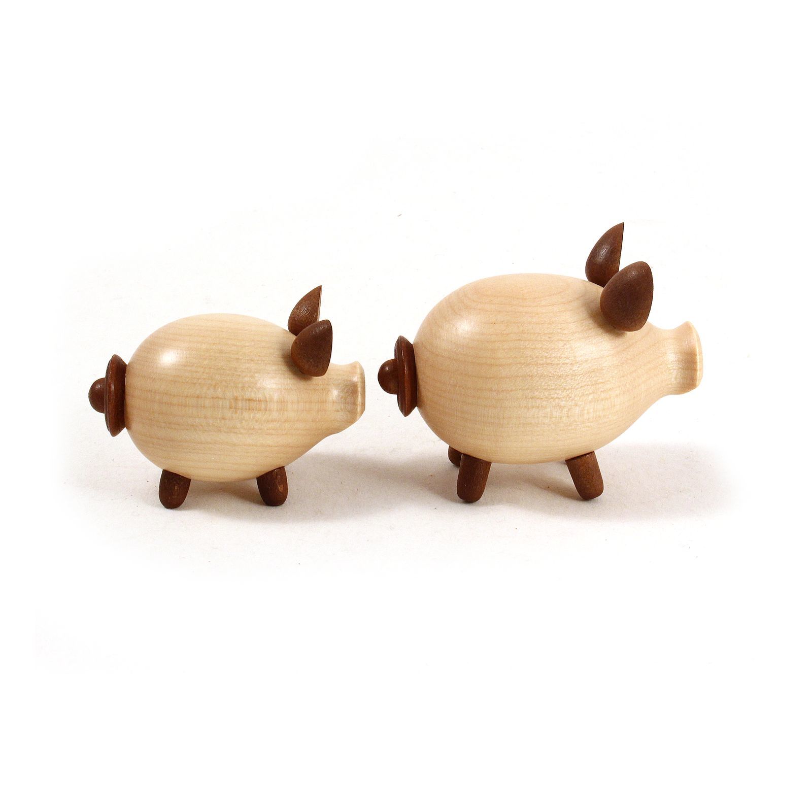 Die Schweinchengarnitur besteht aus einem Salz-und Pfefferstreuer sowie einem hölzernen Unterteller.