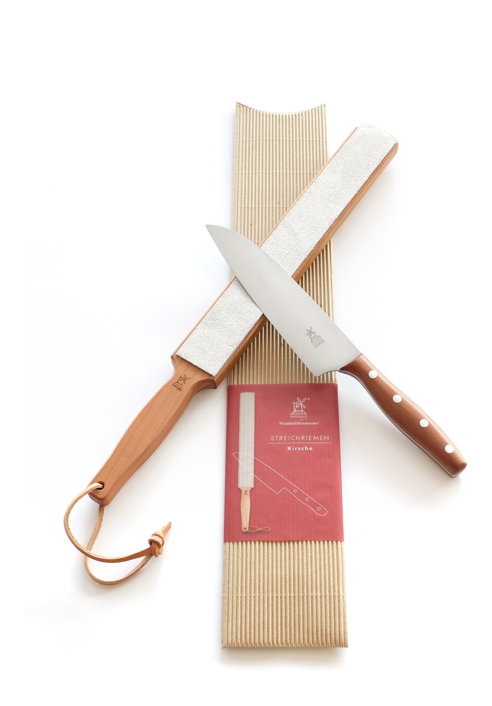 Der Streichriemen selbst besteht vom Kernmaterial her aus edlem Kirschholz und ist gedämpft und geölt. Bezogen wurde auf der einen Seite mit sehr weichem, vegetabil gegerbtem Rindleder, das sehr fein in seiner Oberflächenstruktur ist: 20 micron. Die etwas grobere Seite fühlt sich sehr viel rauher an. Diese ist mit chromgegerbtem, härterem Rindsleder bezogen und mit Diamantine-Pulver bestäubt. Dabei handelt es sich um ein sehr feines Aluminiumoxid-Schleifpulver.Im Ergebnis bleibt die weiche Seite sehr naturbelassen und eignet sich optimal für den Feinabzug Ihrer Messerklingen daheim. Um das Leder selbst müssen Sie sich keine Sorgen machen, auf Grund seines eigenen Fettanteils bleibt es lange geschmeidig und bedarf keiner weiteren Pflege. Hinweis: Bitte ziehen Sie das Messer nicht gegen die Schneide, wie Sie es vielleicht vom Wetzstahl her gewohnt sind! Beim Streichriemen ist es empfehlenswert, das Messer immer so zu halten, als würden Sie eine Stulle mit Butter bedecken wollen. Die Ziehrichtung wechseln Sie am besten direkt über den Klingenrücken und nicht über die Schneide.