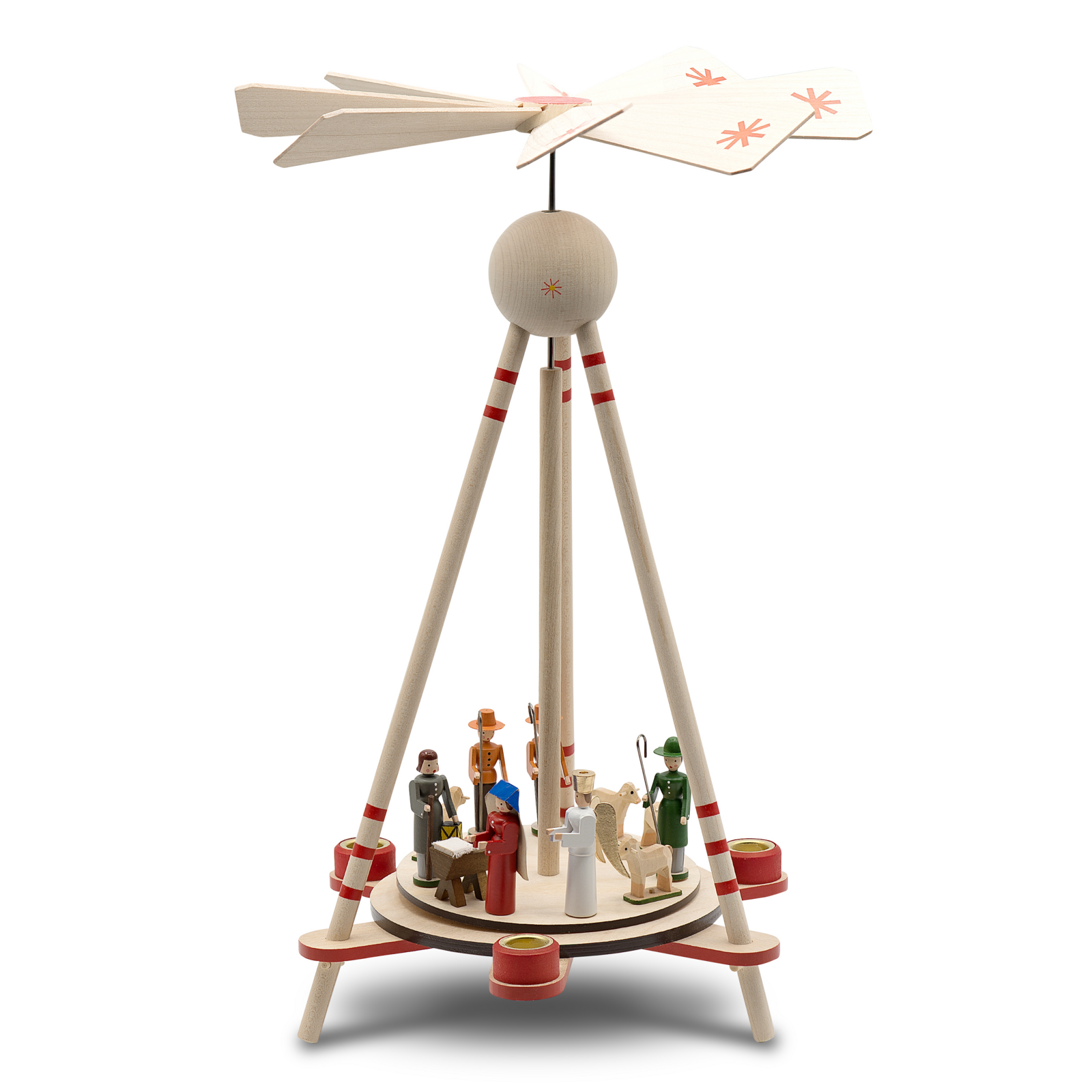 Nach Originalentwürfen von Max Schanz ist die Krippenpyramide in einer erzgebirgischen Manufaktur gefertigt, die auf eine langjährige Firmengeschichte zurückblickt. Nach alten, überlieferten Formen und Farben werden Pyramiden in Seiffen gefertigt. Hier kennt das Kunsthandwerk eine jahrhundertelange Tradition.