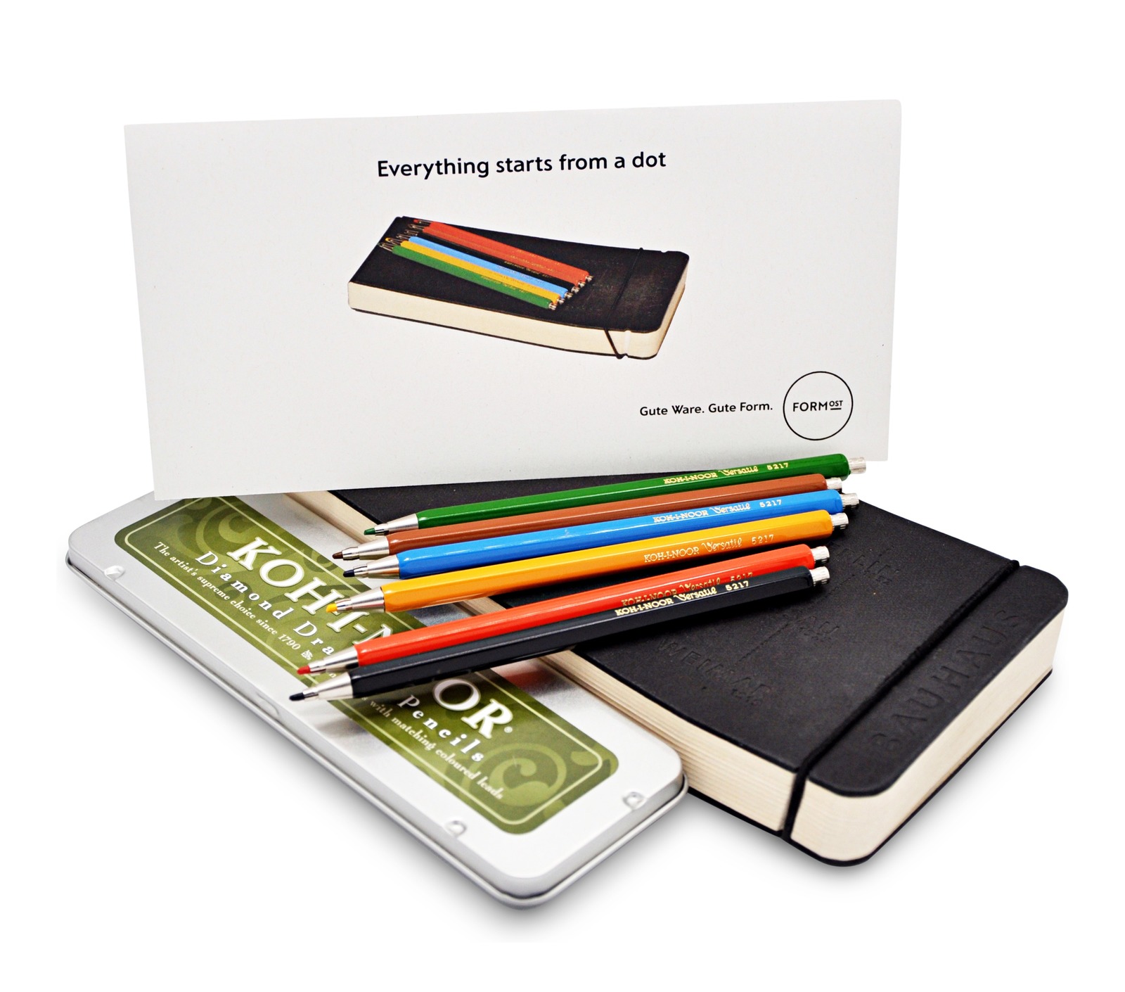 das BAUHAUS Skizzenbuch, das KOH-I-NOOR Bleistiftset, eine Grußkarte sowei die Geschenkverpackung