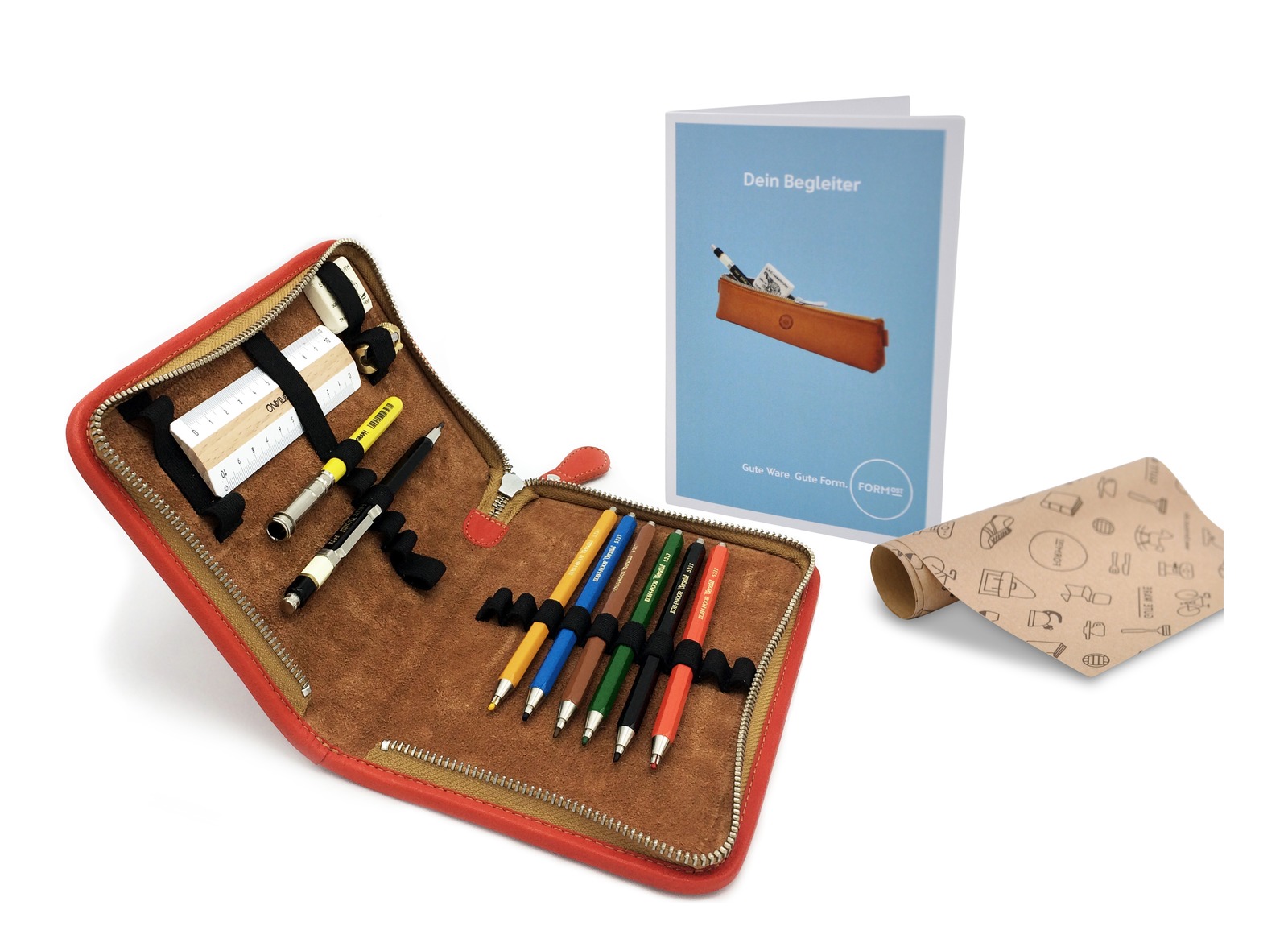 Ein Schreibetui für Kenner. Mit hochwertigen Stiften von KOH-I-NOOR aus dem südlichen Böhmen, einem Anspitzer der Münchner Papeterie Carta Pura, einem Lineal der 1265 gegründeten italienischen Papiermanufaktur Fabriano und zu guter Letzt dem Schreibetui der süddeutschen Ledermanufaktur Sonnenleder.