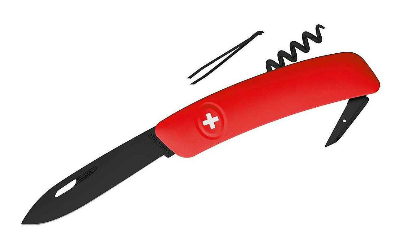 Mit dem SWIZA D01 ALLBLACK bringt der Schweizer Hersteller ein Messer auf den Markt, das alle Blicke auf sich zieht. Das schwarze Messer ist mit einer hoch widerstandsfähigen, tiefschwarzen Hightech-Beschichtung aus Polytetrafluorethylen (PTFE) ausgestattet. Die 75mm lange Klinge aus PVD-beschichtetem Edelstahl 440 (gehärtet auf 57 HRC) arretiert und lässt sich durch Druck auf das Schweizer Kreuz - Markenzeichen von Swiza - wieder einklappen. Die leichte Krümmung des Messers ermöglicht ein müheloses Aufklappen aller Werkzeuge, die rote Anti-Rutsch-Oberfläche erleichtert eine intuitive Handhabung. Das D01 besitzt außerdem eine Stech- und Bohrahle, eine Pinzette mit abgeschrägter Spitze und einen Sommelier-Korkenzieher mit 5 Windungen.