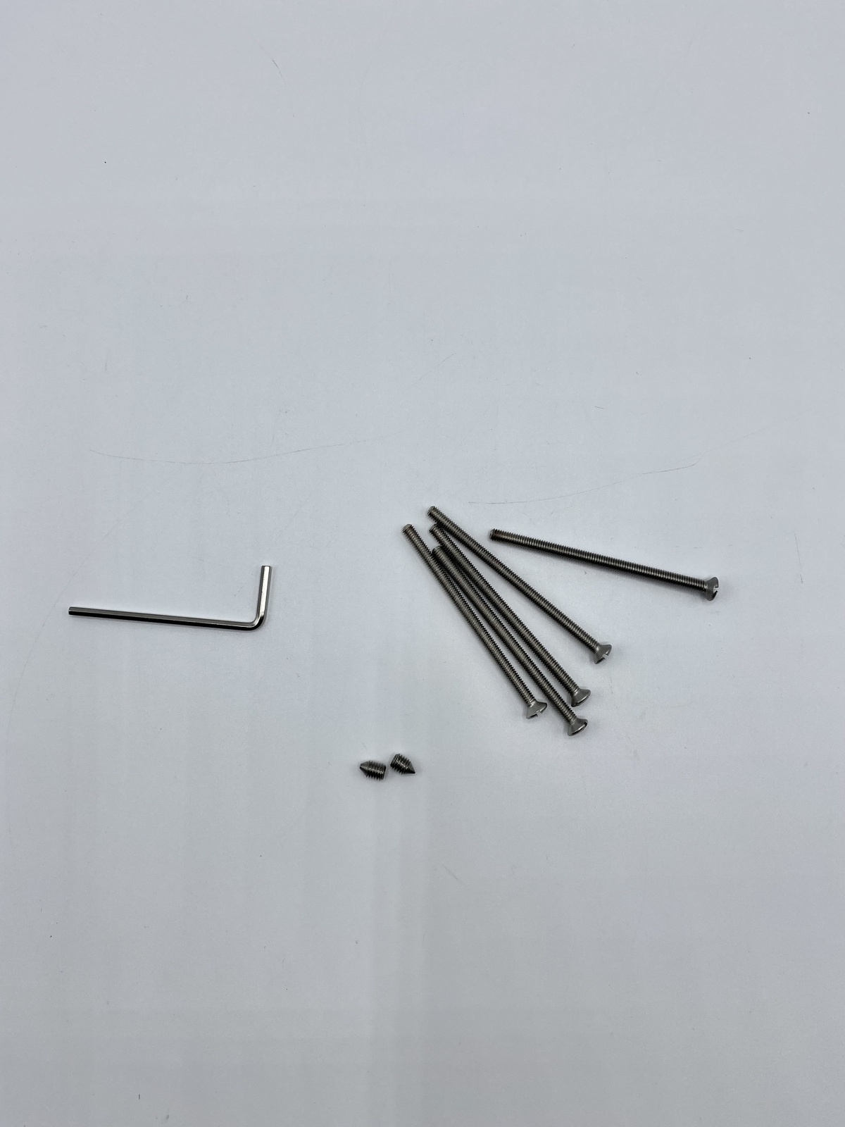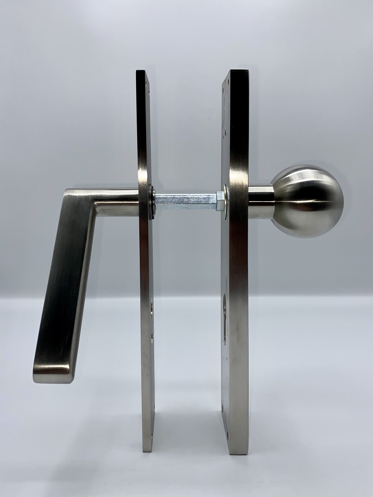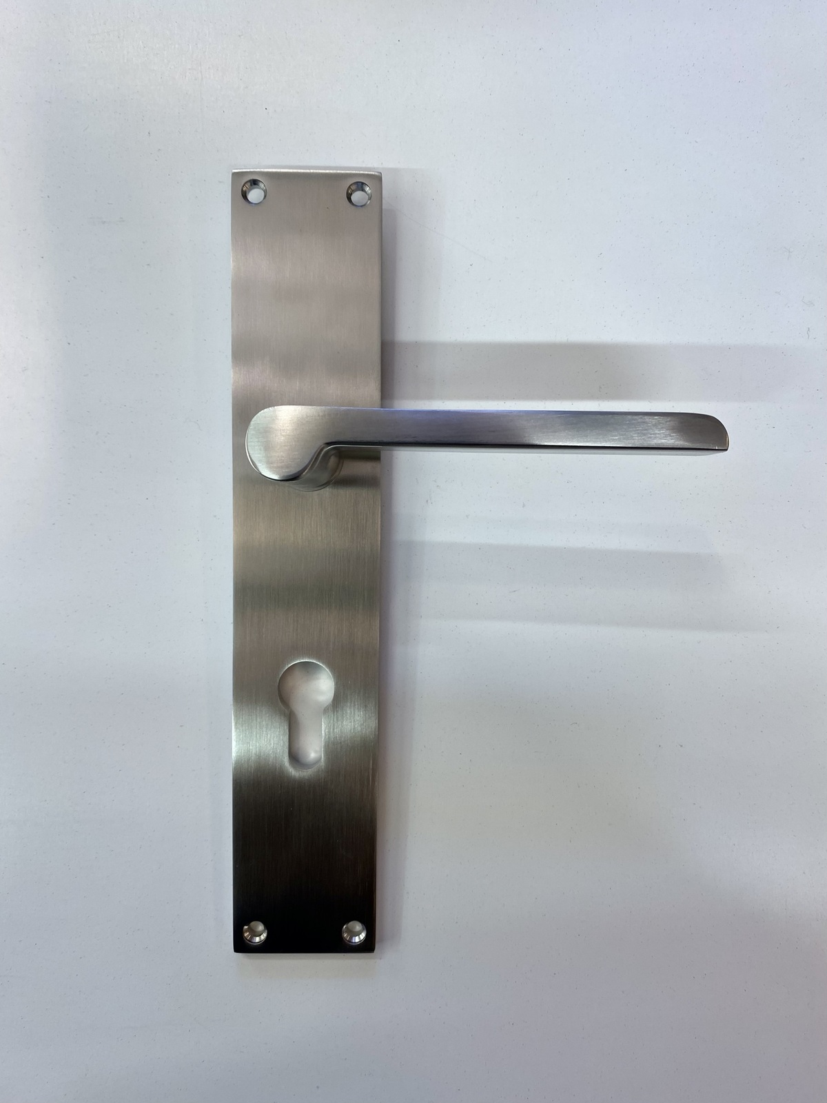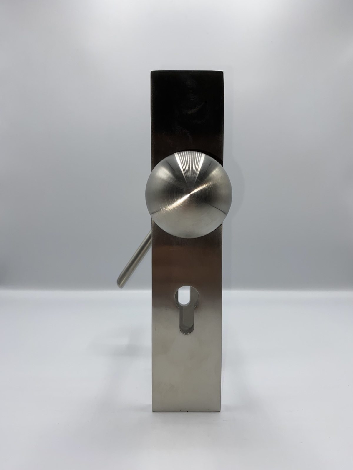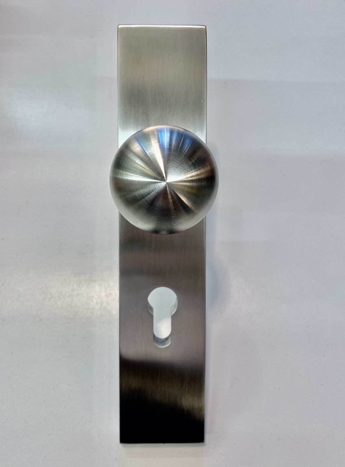 Content0,5 Türdrückerpaar matt, 0,5 eckiges Langschildpaar matt, 1 Sicherheitstürschild mit feststehenden Krauf matt