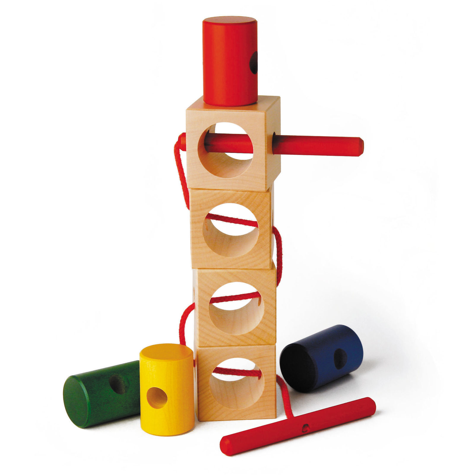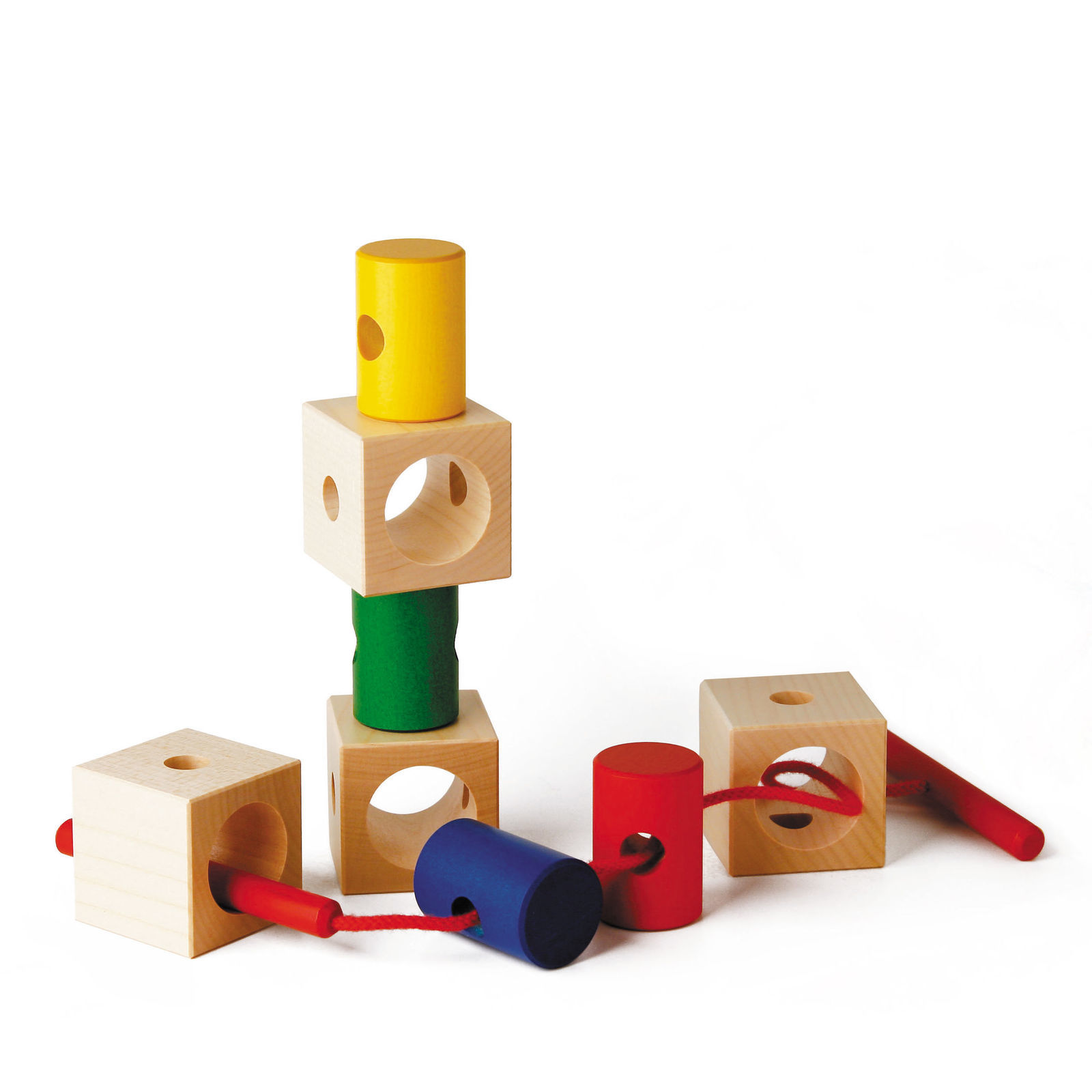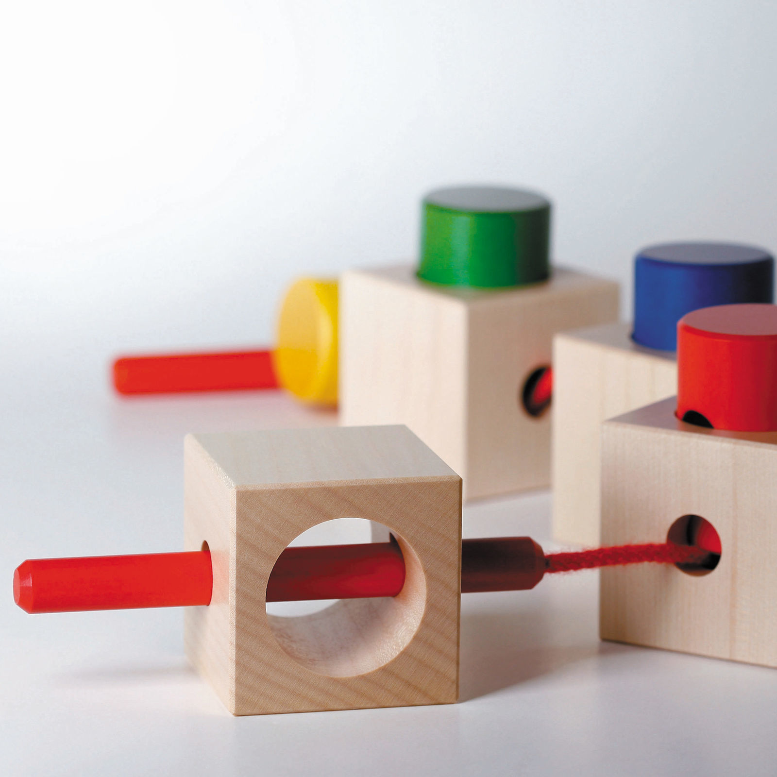 Signa ist so konzipiert, dass das Kind immer wieder Herausforderungen findet, denn die Würfel haben kleine und grosse Bohrungen für das Einfädeln der Kordel.