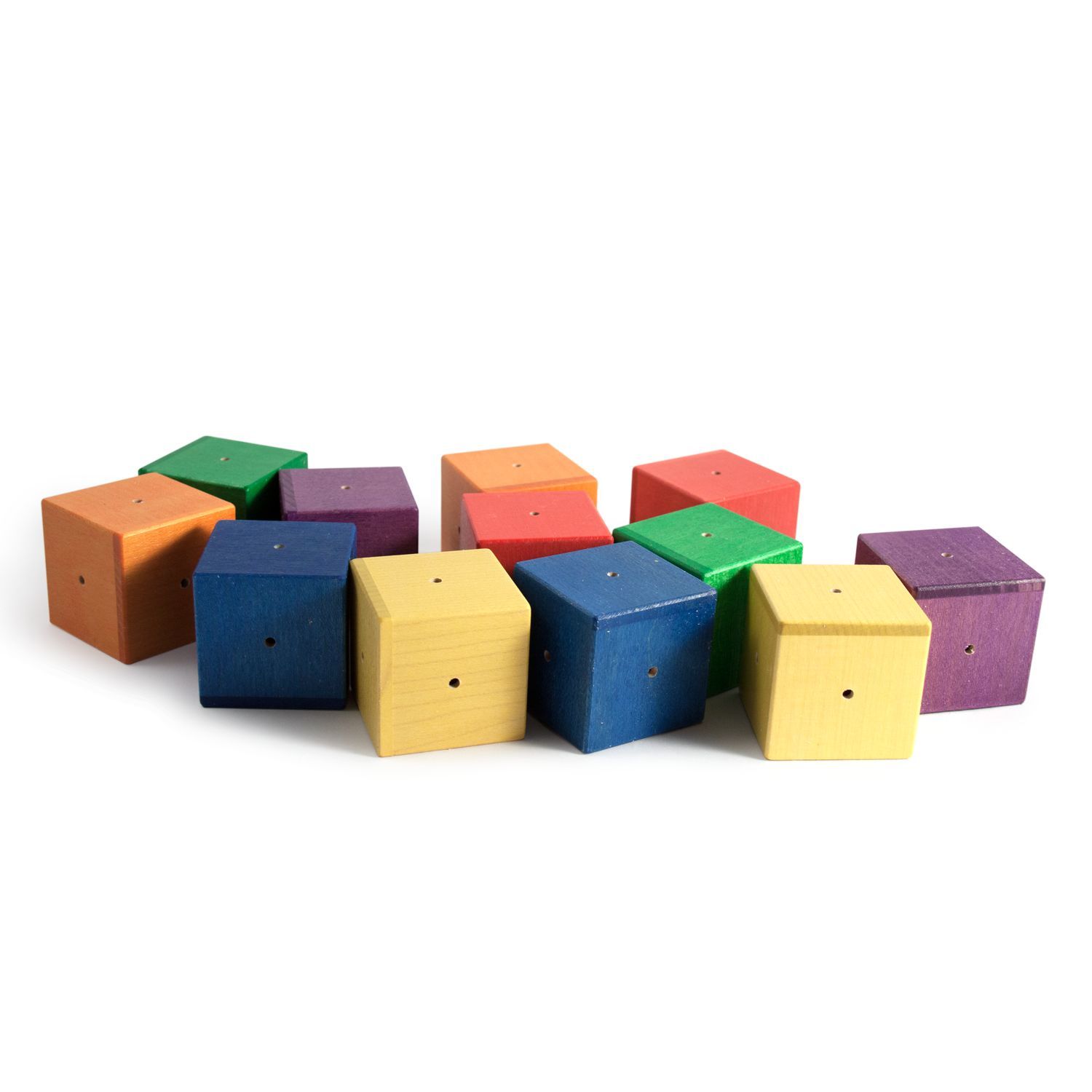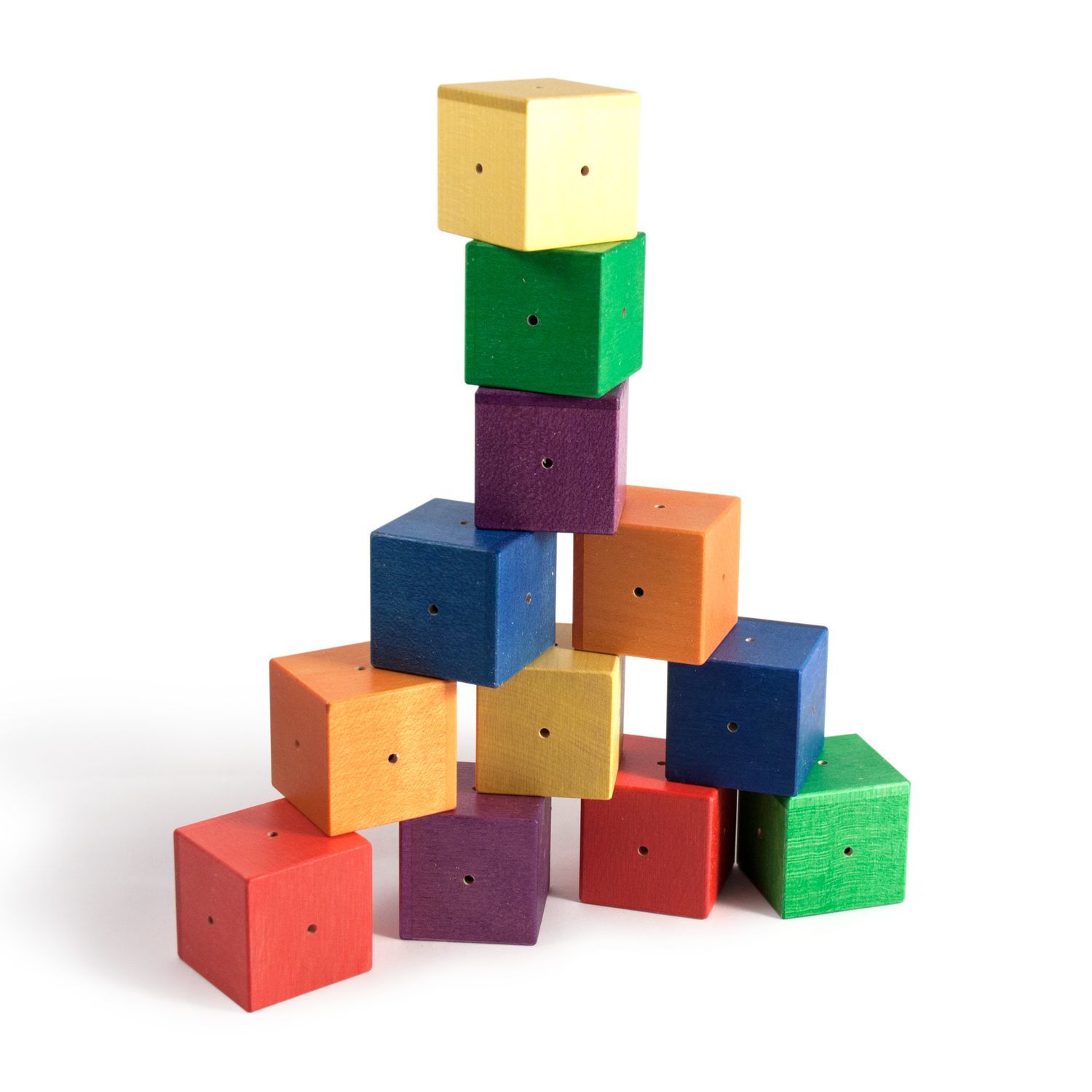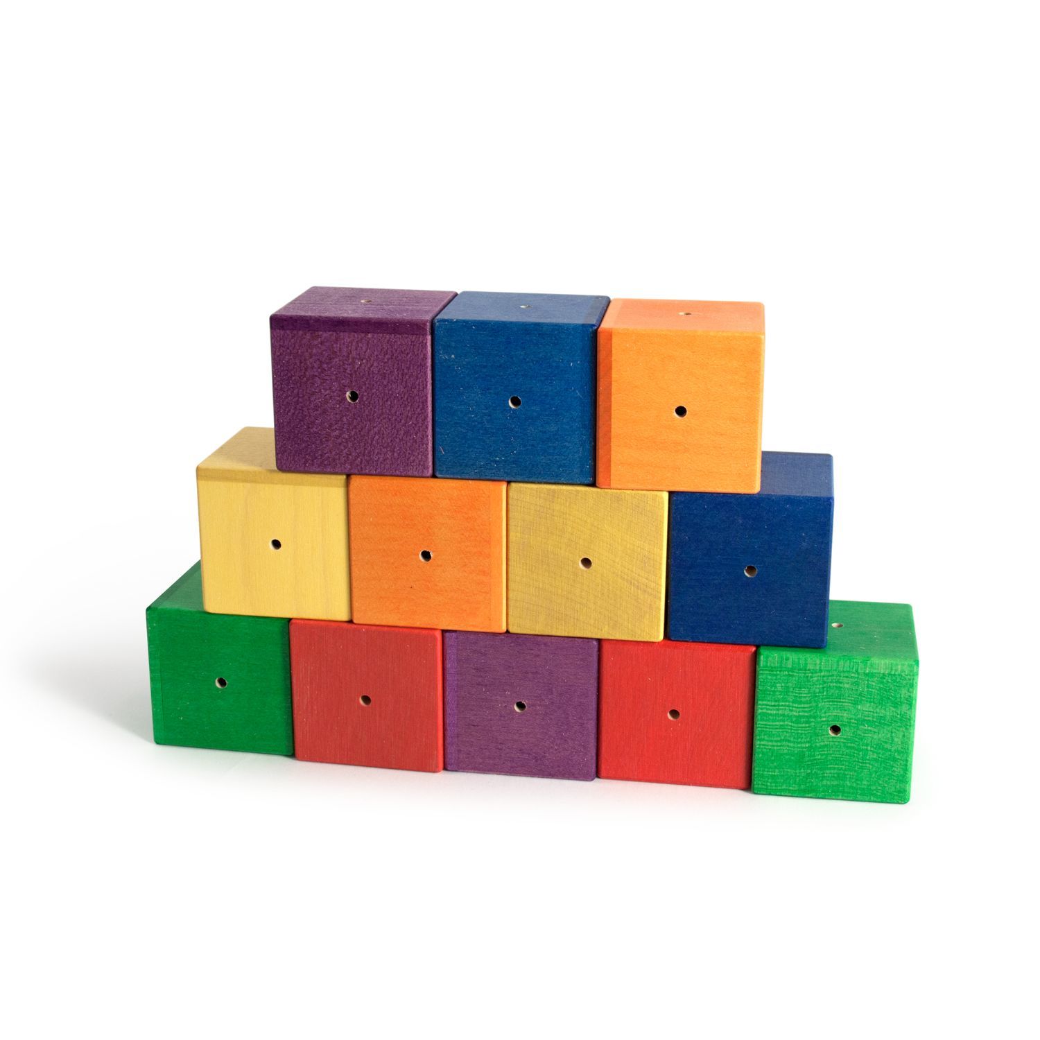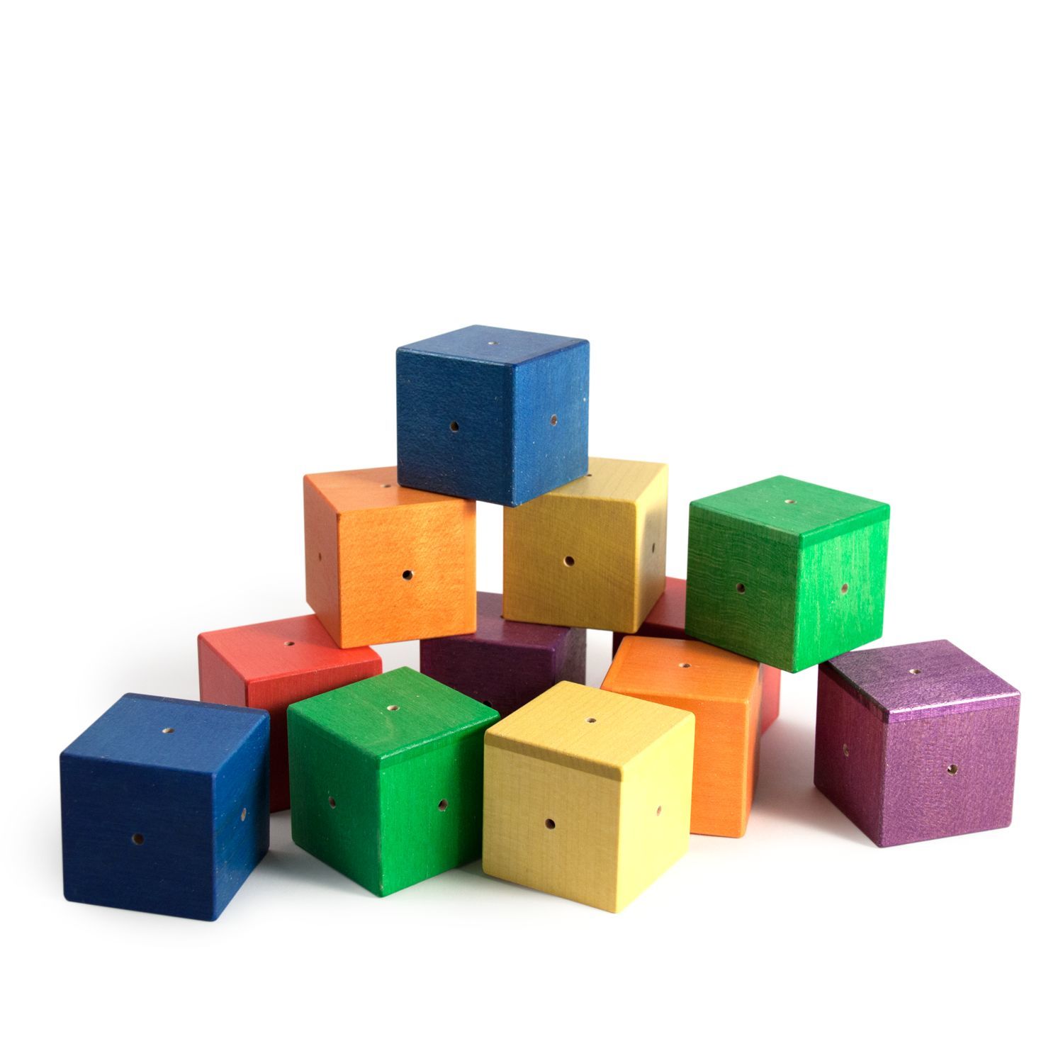 Die 12 Buchenholz-Bausteine unterscheiden sich nicht nur in ihrer Farbgebung, sondern sind auch mit unterschiedlichen Klangkörpern gefüllt, wobei gleiche Farben auch einen gleichen Klang bedeuten. Hat ein Kind z.B. mit geschlossenen Augen die akustische paarweise Zuordnung ausgeführt, kann es dies danach optisch selbst kontrollieren.