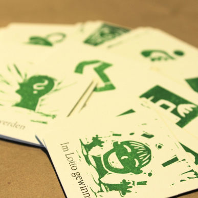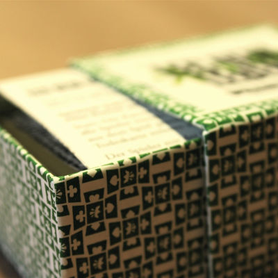 | Material | Bleisatz, Hochdruck, Kaschur, Kartenstanzung und Schachtelbau in Handarbeit in der Spielkartenfabrik Stralsund |