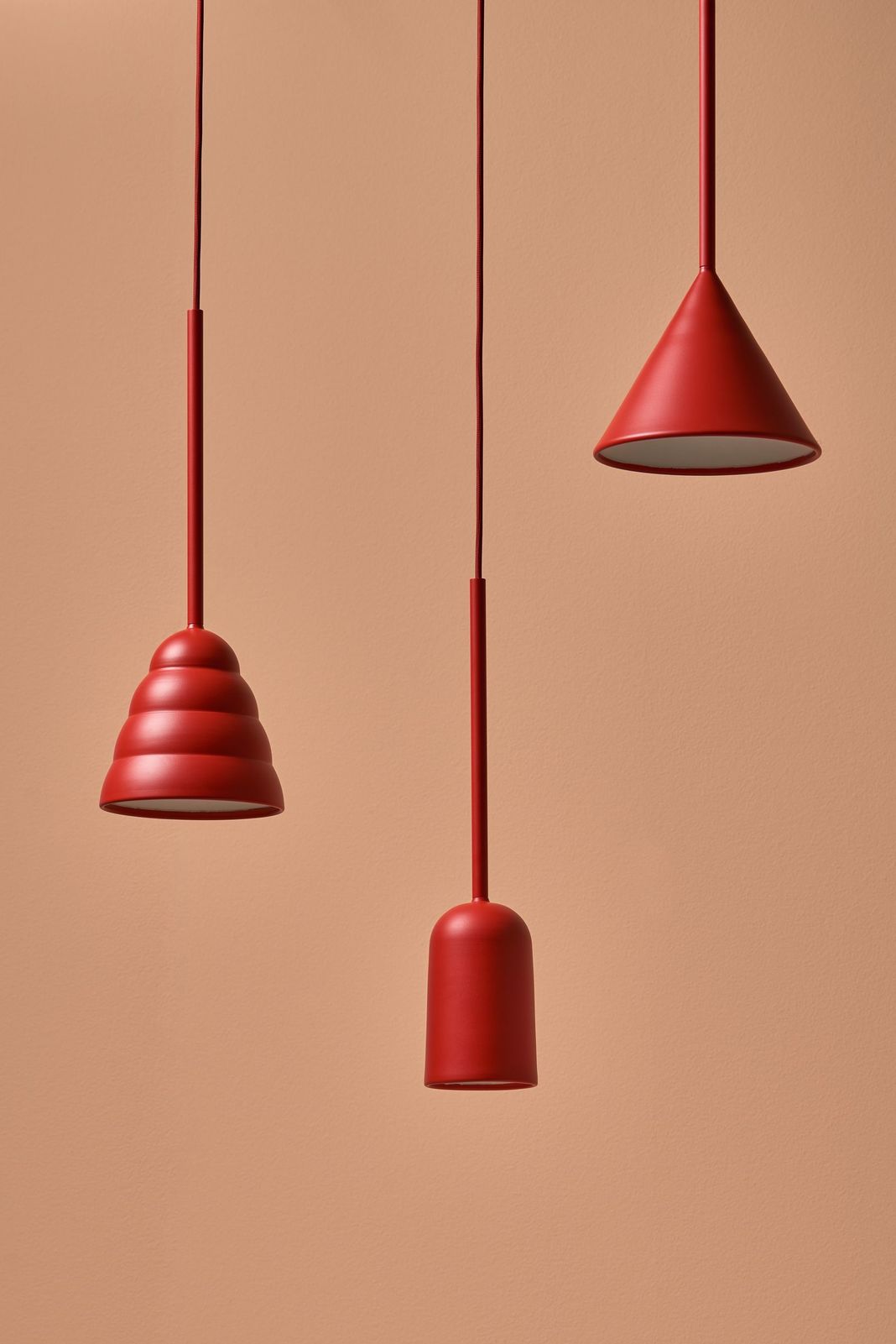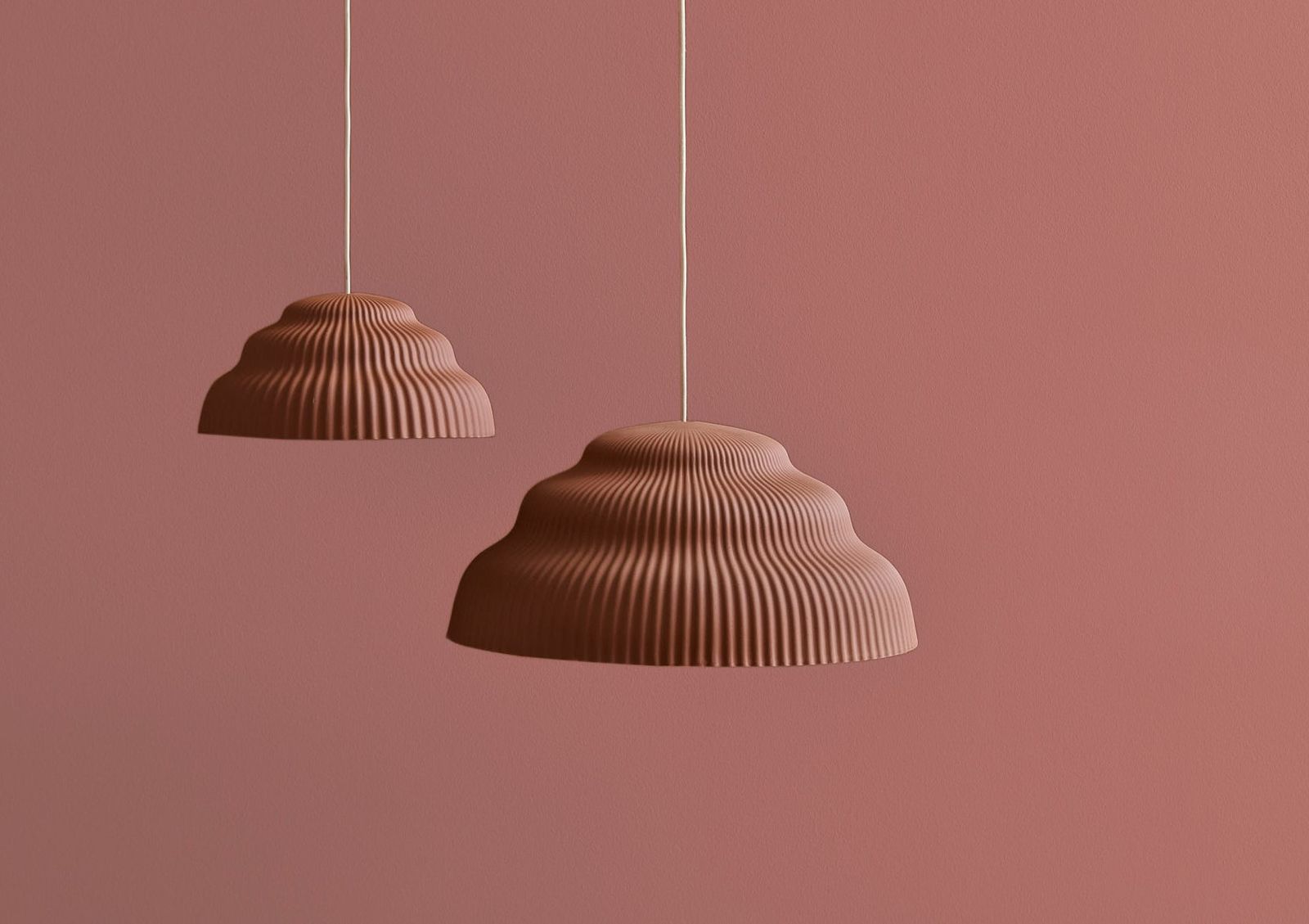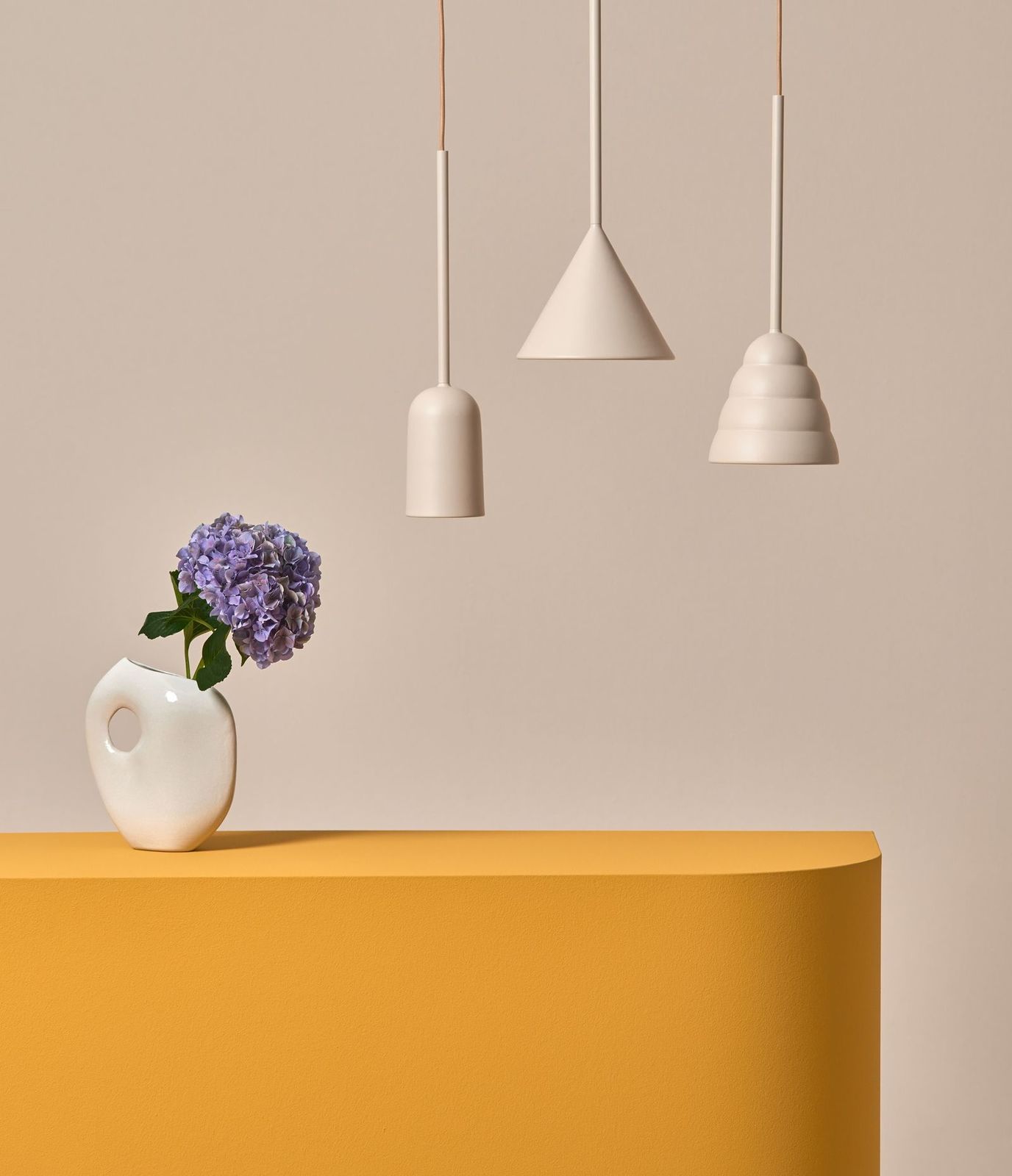 Kaskad hat eine rohe, farbige Keramikoberfläche. Die Hängeleuchte ist in zwei verschiedenen Größen und drei Farben erhältlich und wird durch ein farblich abgestimmtes Textilkabel ergänzt. Die Kaskad kann sowohl als Einzelstück als auch aufgehängt in einer wolkenartigen Familie von Kaskad-Lampen verwendet werden.