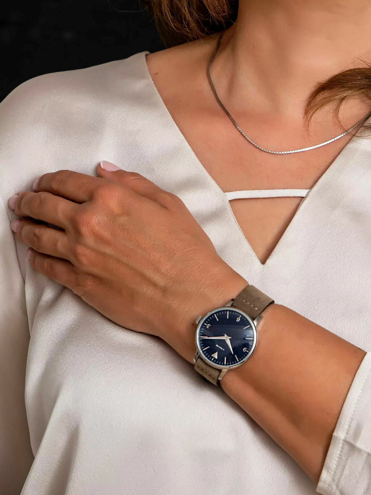Die Qual der Wahl besteht hierbei zwischen einem Metallarmband in silber oder einem Veloursleder Armband.