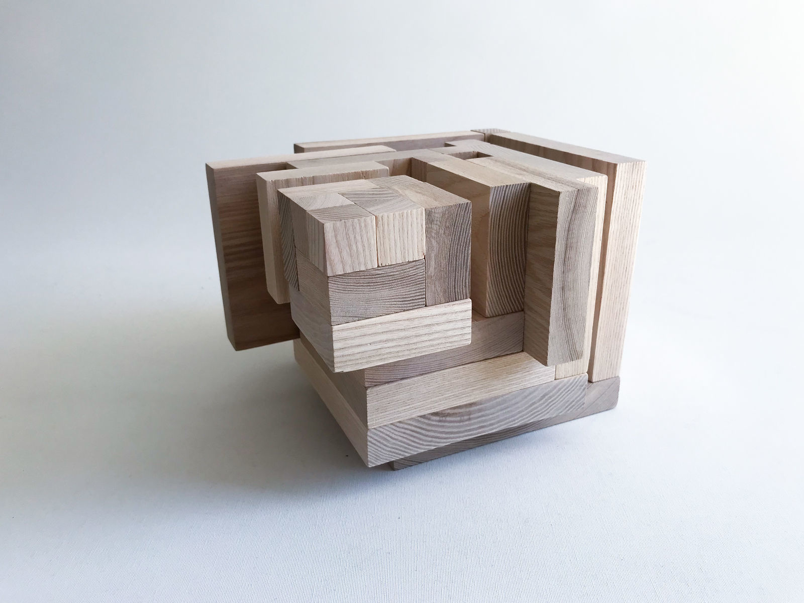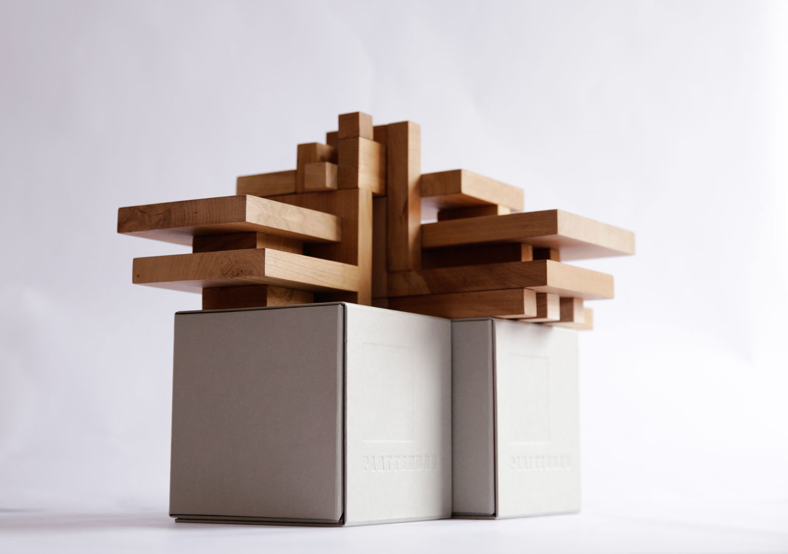 PLATTENBAU is made up of 25 velvety softly polished, geometric pieces of precious wood that build on each other and which when put together form a cube. This multi-layered wooden cube is packaged in a sophisticated, stone-grey cardboard box with a blinding embossing on the outside and a bright pink on the inside, which closes magnetically.