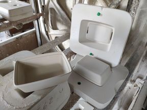Ausgeformte Hohlteile, unter anderem unserer Saftkrug oder die allseits geliebte Seifenschale, werden aus einer flüssigen Porzellanmasse - dem Schlicker - in Gipsformen "gegossen". Diesen Prozess nennt man Hohlguß oder Hohlteilfertigung, weil die eingebrachte Porzellanmasse nicht vollständig zu einem Festkörper aushärtet.