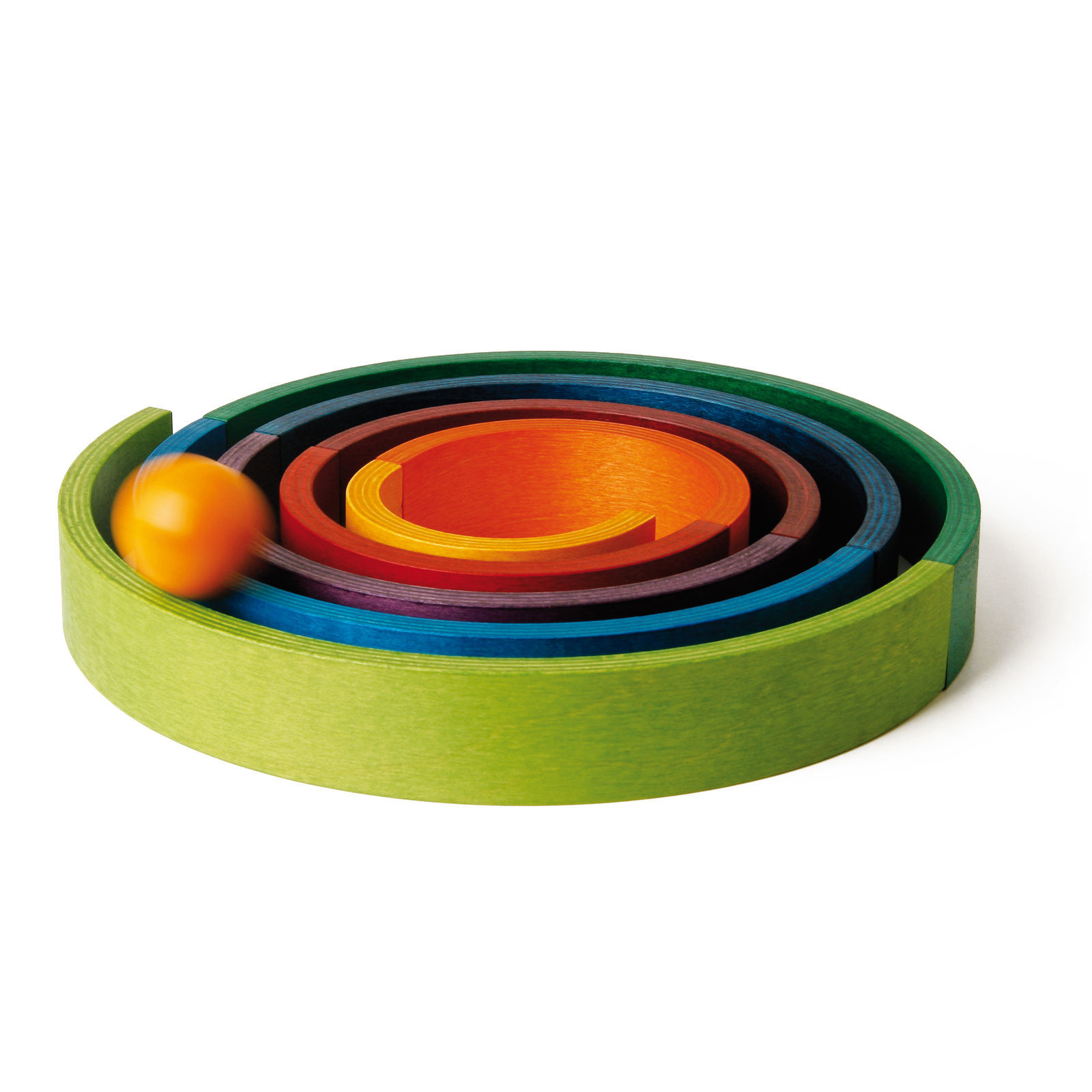 Brilliante Regenbogenfarbtöne und das hochwertig verarbeitetete Holz machen Rainbow zu einem Spiel- und Kunstobjekt mit grosser haptischer Qualität. Virtuos die Balance finden, schwer ist es nicht, denn es gibt viel zu entdecken. Leuchtkraft und Schlichtheit der Bogenelemente verführen immer wieder dazu, Farben und Klänge neu miteinander zu kombinieren und die Kugel rollt auf der „Regenbogenbahn“.